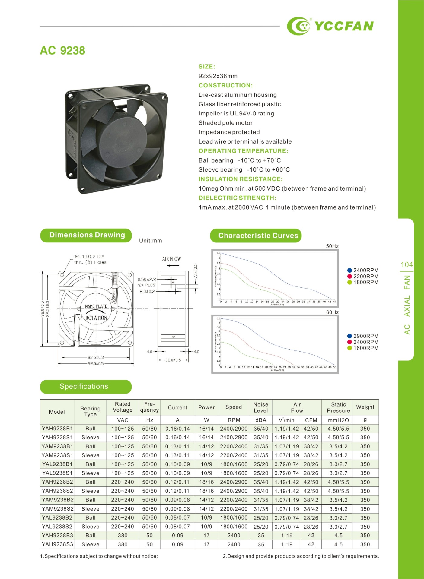 YAL9238S1 | Sleeve | 100~125 | 50/60 | 0.10/0.09 | 10/9 | 1800/1600 | 25/20 | 0.79/0.74 | 28/26 | 3.0/2.7 | 350 |
