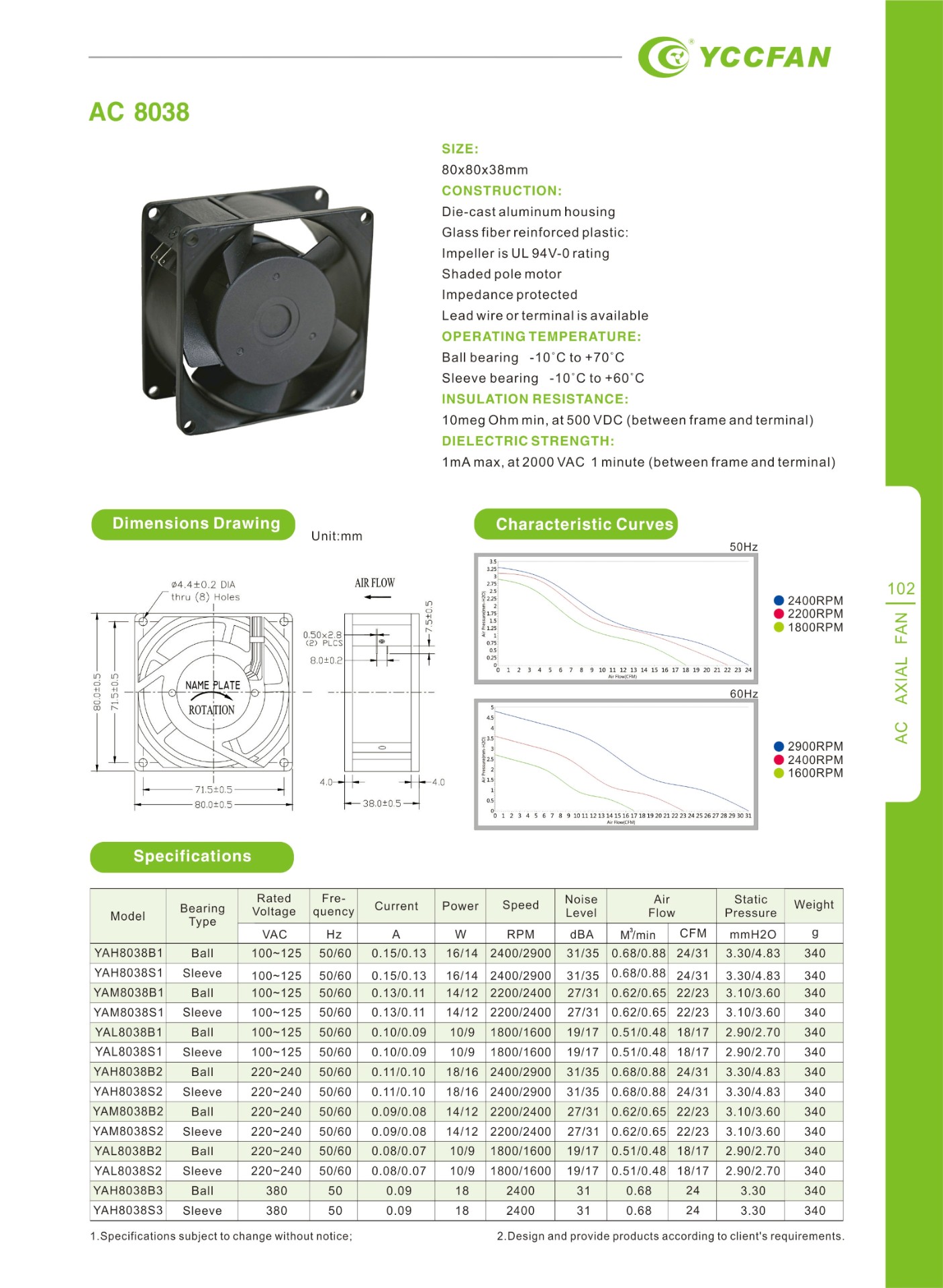 YAL8038S1 | Sleeve | 100~125 | 50/60 | 0.10/0.09 | 10/9 | 1800/1600 | 19/17 | 0.51/0.48 | 18/17 | 2.90/2.70 | 340 |