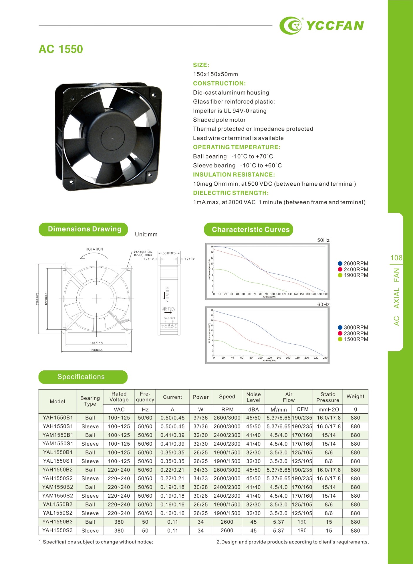 YAL1550S2 | Sleeve | 220~240 | 50/60 | 0.16/0.16 | 26/25 | 1900/1500 | 32/30 | 3.5/3.0 | 125/105 | 8/6 | 880 |