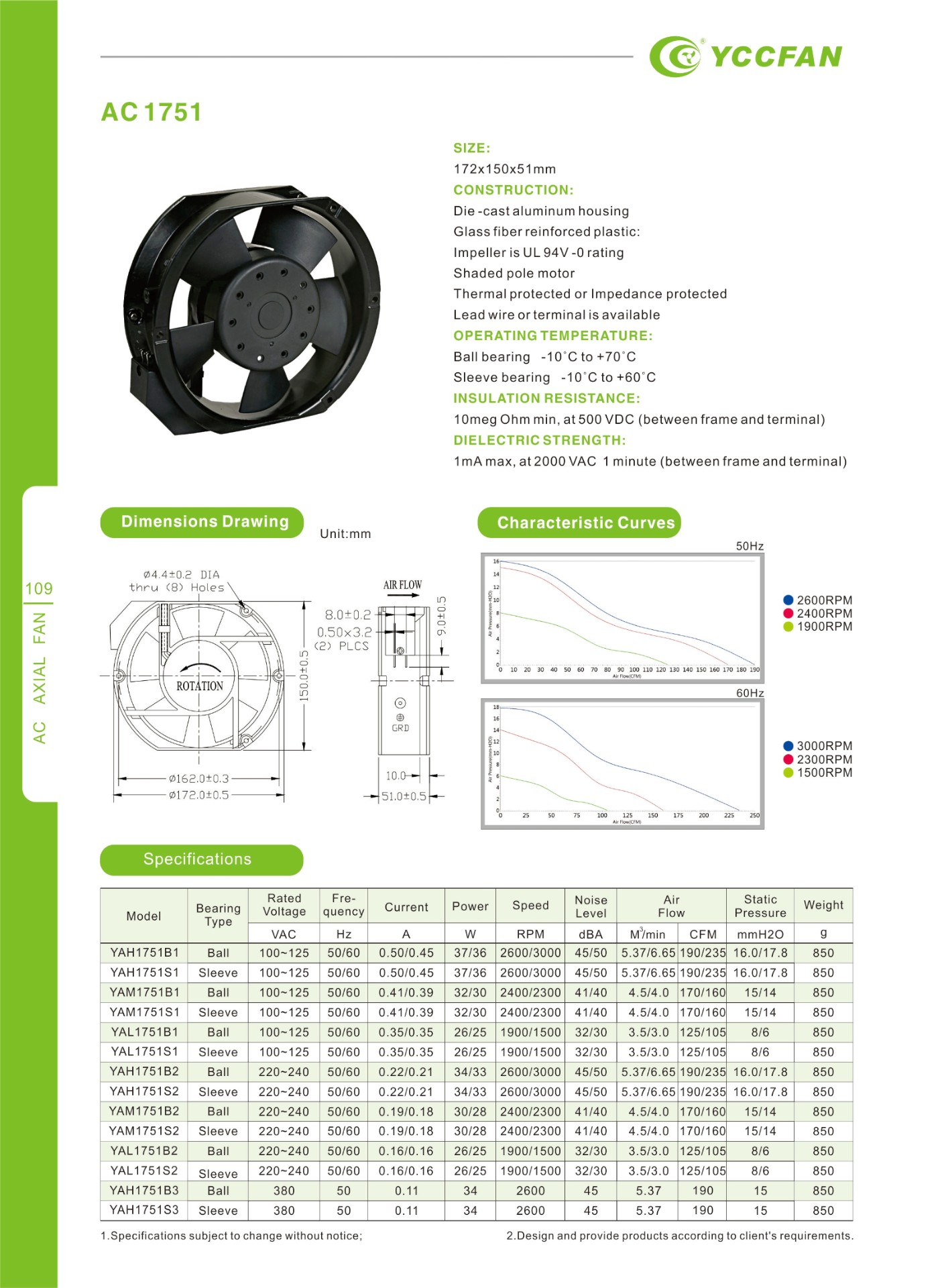 YAL1751S1 | Sleeve | 100~125 | 50/60 | 0.35/0.35 | 26/25 | 1900/1500 | 32/30 | 3.5/3.0 | 125/105 | 8/6 | 850 |