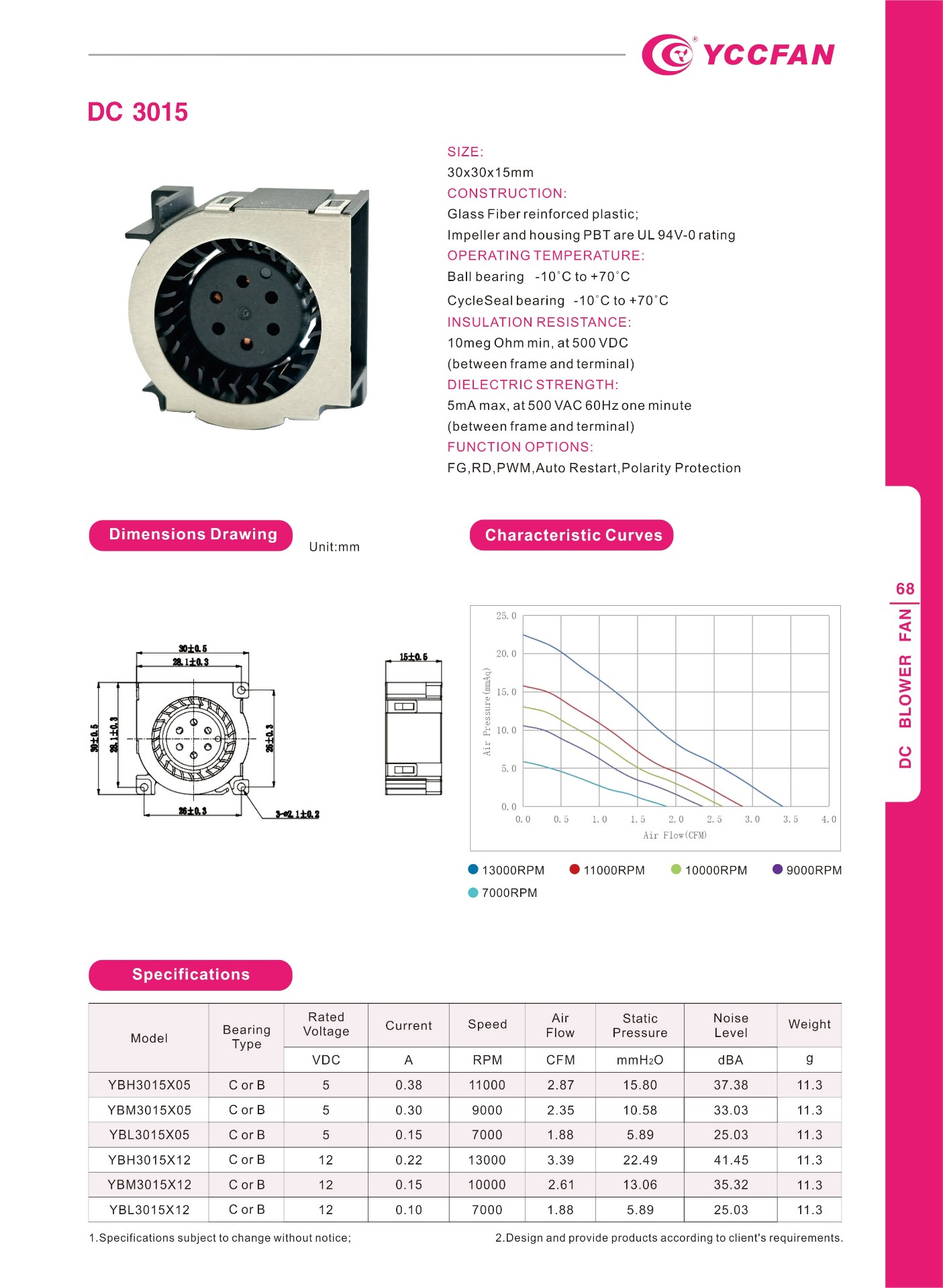 CONSTRUCTION:Glass Fiber reinforced plastic; Impeller and housing PBT are UL 94V-0 rating