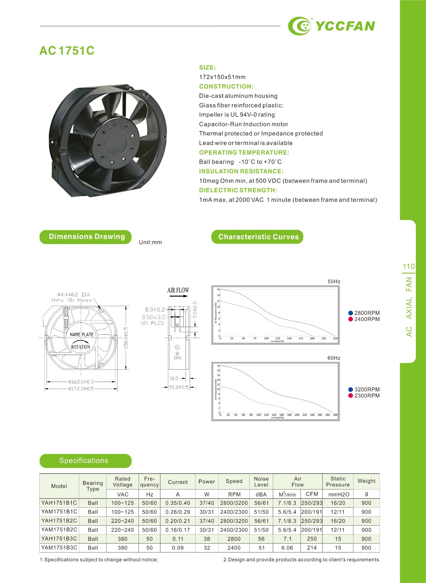 YAM1751B1C | Ball | 100~125 | 50/60 | 0.26/0.29 | 30/31 | 2400/2300 | 51/50 | 5.6/5.4 | 200/191 | 12/11 | 900 |