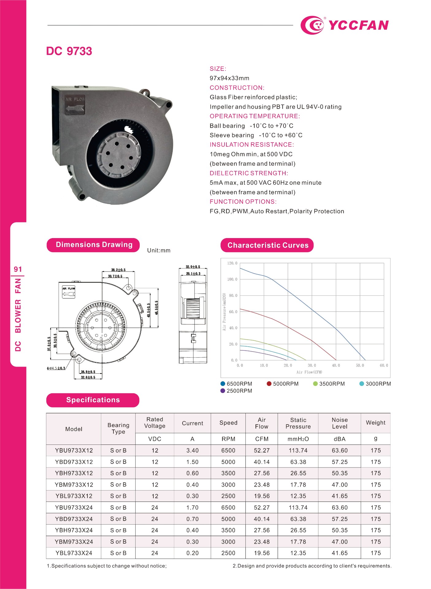 Model | Bearing Type | Rated Voltage | Current | Speed | Air Flow | static Pressure | Noise Level | Weight |