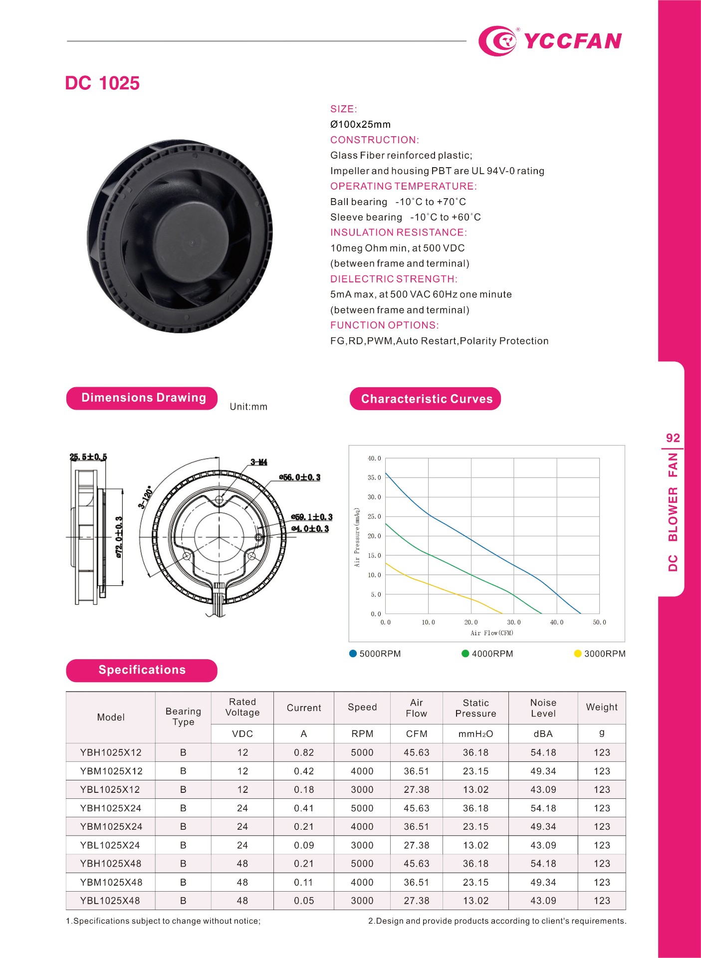 Model | Bearing Type | Rated Voltage | Current | Speed | Air Flow | static Pressure | Noise Level | Weight |